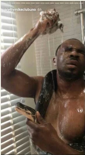 Pretty Mike who was this year arrested by the police over an anti-social behaviour of putting ladies on leash has shared pictures of himself battling with a pet snake.