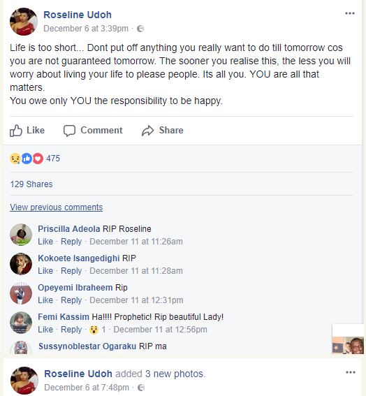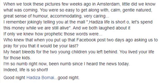 Four days before her death, she made a post about life been too short, so it should be enjoyed. That same day, she mourned the death of a female friend named Hadiza who passed away earlier.