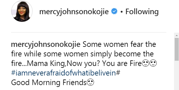 The mother of three posted a picture of Tonto Dike on her Instagram page, and accompanied it with this caption: "Some women fear the fire while some women simply become the fire...Mama King,Now you? You are Fire#iamneverafraidofwhatibelivein# Good Morning Friends."