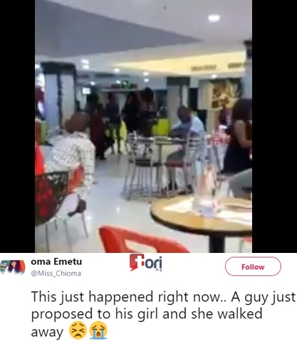 A Twitter user identified as Oma Emetu (@Miss_Chioma), has taken to the social networking platform and shared a video clip showing the heartbreaking moment when a lady publicly turned down her boyfriend's marriage proposal at a fast food restautant.