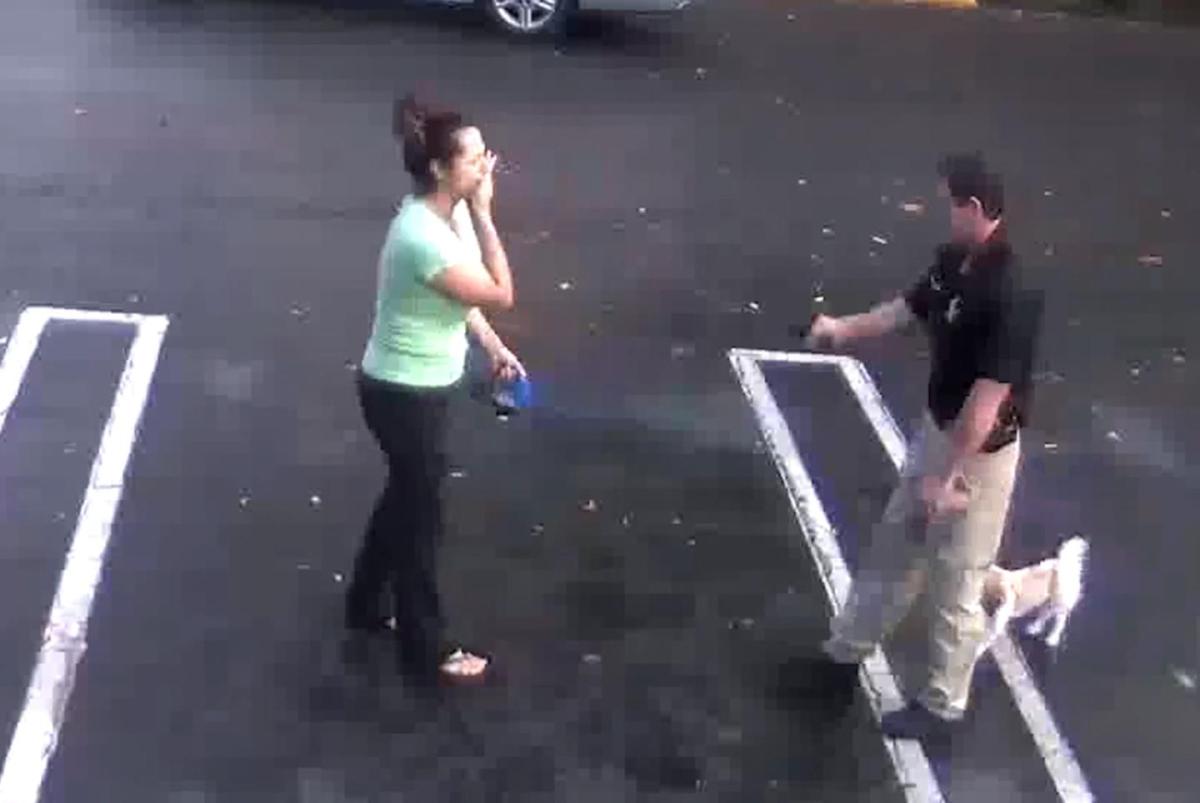 When they reappear, Solano can be seen backing away and holding her hand to her face in apparent fear while DeMarco raises the gun and points it at her.