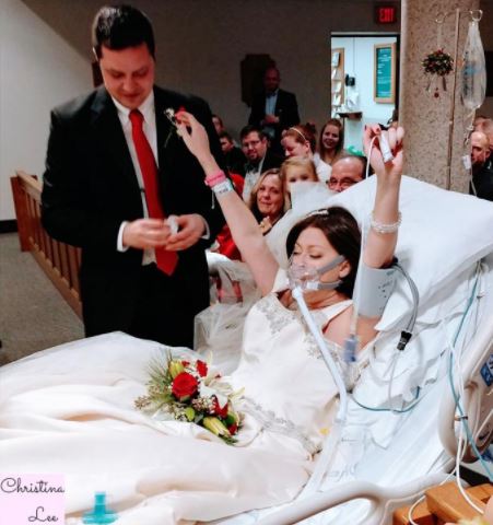 Heather Lindsay and husband David Mosher exchanging marital vows on her sick bed