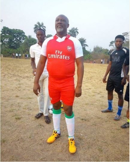 Senator Dino Melaye hasn't hidden his passion for football as he was pictured exercising himself with some young men as he rocked an Arsenal FC jersey.