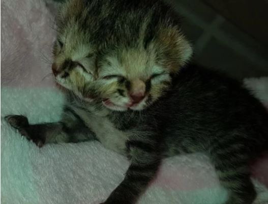 Her owner took it to a nearby cat rescuer who is known for taking in special needs cats. The rescuer, started tube-feeding the kitten. She said she could “feed either mouth, both are functional, both lead to the stomach.”