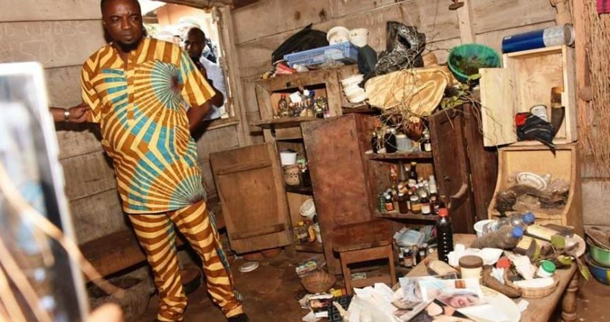 The kiosk was littered with fetish accessories, including figurines, rocks, bottles of mixture, cowry-embedded apron, pictures of white men and women, black pots, goats, chickens among others.