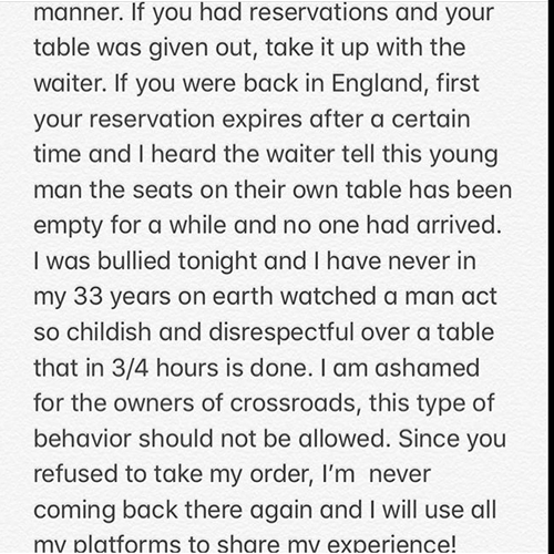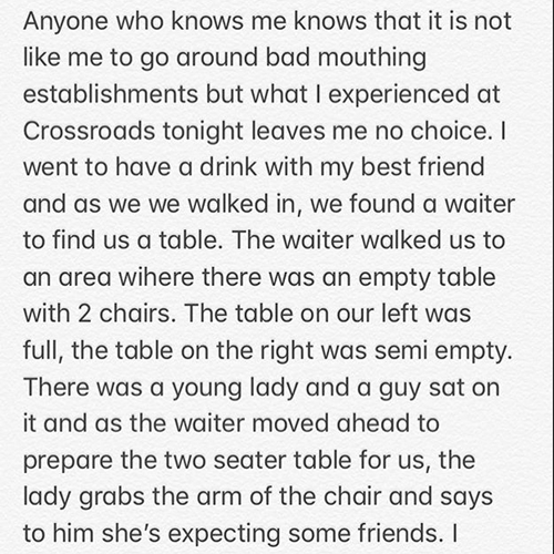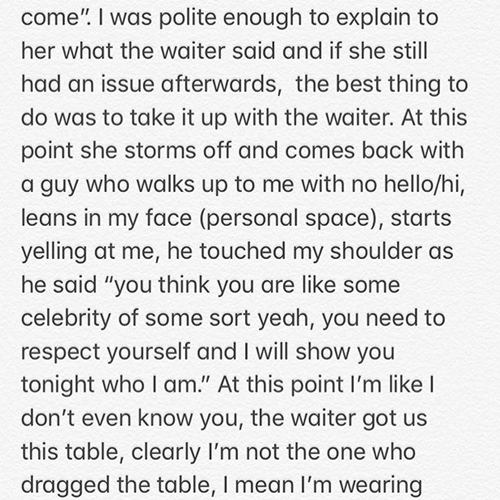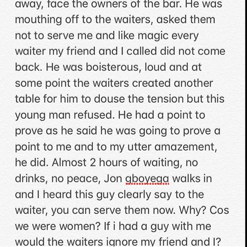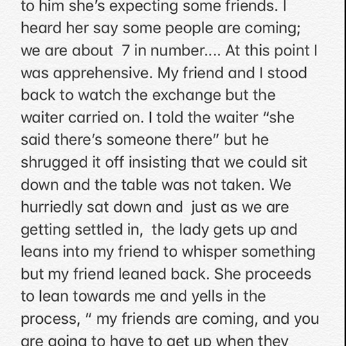 According to her she was not only stopped from sitting down, The body guard even went as far as stopping the waiters from serving any drink to her.