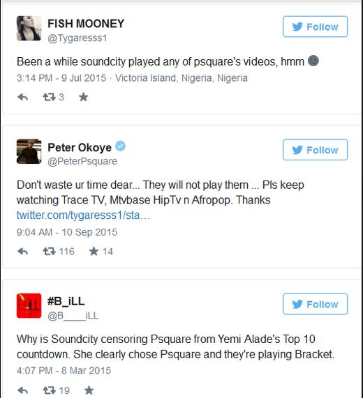 Soundcity has declined to showcase any of Psquare's music videos in recent times, hence their call to fans to boycott the TV channel in fovour of the other music channels.