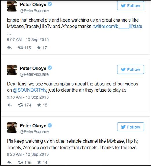 Peter Okoye of Psquare has openly instructed Psquare fans not to watch Soundcity Channel as the music station has refused to air their videos even at the demand of fans and celebrities.
