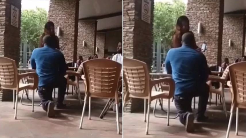 The incident reportedly occurred at a mall in Accra, Ghana. The couple was seen having a discussion at a restaurant when the young man went on one knee to pop the question, he looked shocked when his girlfriend immediately stood up and showed him something on her phone.