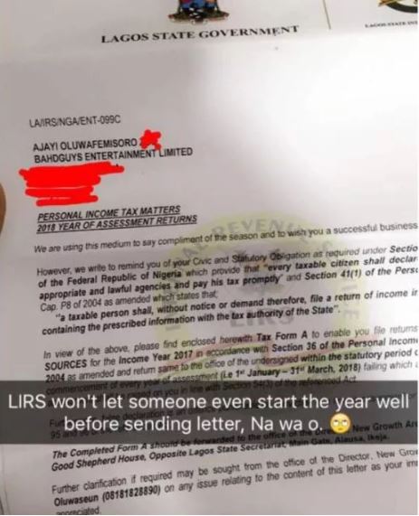 The rapper who obviously had a very successful career in the year 2017 revealed that he received a letter from the LIRS to come and remit his personal income tax for the year 2017.