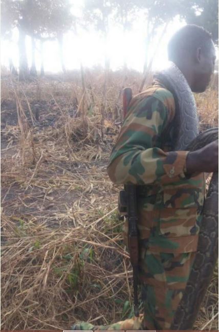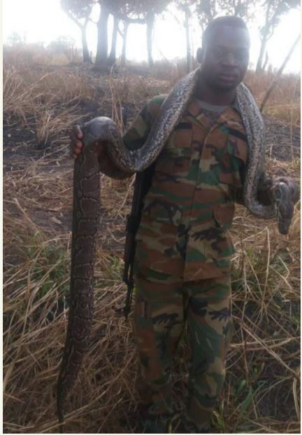 A military officer caught this huge python and bravely displayed it on his neck as he searches for a competent cooking pot to prepare a sumptous meal for himself and his colleagues.