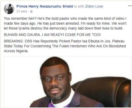 PoliticsNGR has revealed that a Pentecostal pastor, Isa Elbuba was almost arrested by the Department of State Security (DSS) for criticizing the activities of Fulani herdsmen.
