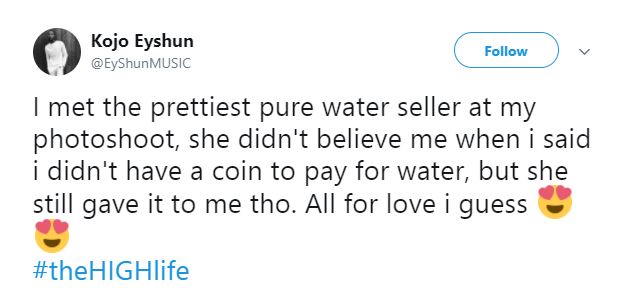 "I met the prettiest pure water seller at my photoshoot, she didn’t believe me when i said i didn’t have a coin to pay for water, but she still gave it to me tho. All for love i guess