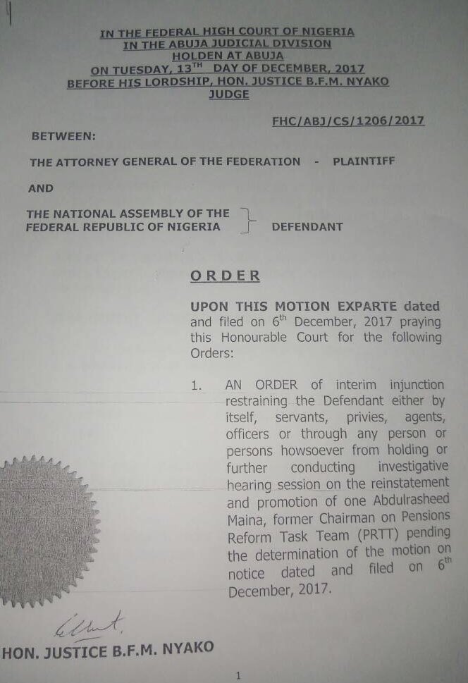 In the case (FHC/ABJ/CS/1206/2017 ), the AGF had sought an interim injunction restraining the National Assemby, its agents, servants or any other person from holding a hearing session on the reinstatement of Mr. Maina, who was reinstated into the Federal Civil Service on the sly after fleeing Nigeria in 2013, an action that bore the imprimatur of the AGF.