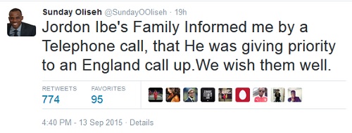 "Jordon Ibe’s family informed me by a telephone call, that he was giving priority to an England call-up. We wish them well," Oliseh tweeted.