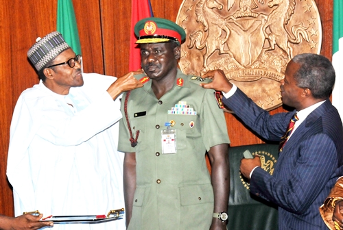 The Chief of Army Staff, Buratai being decorated by President Buhari and VP Osinbajo