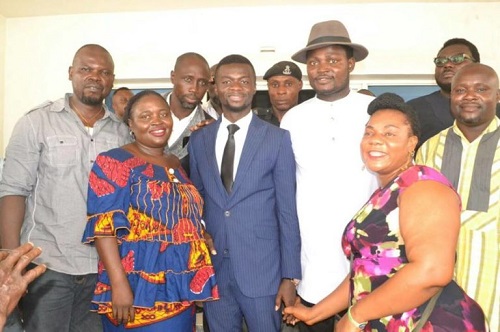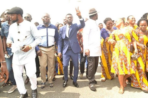 33-year-old Ibarakumo Otobotekere makes a sign as he is flanked by well-wishers
