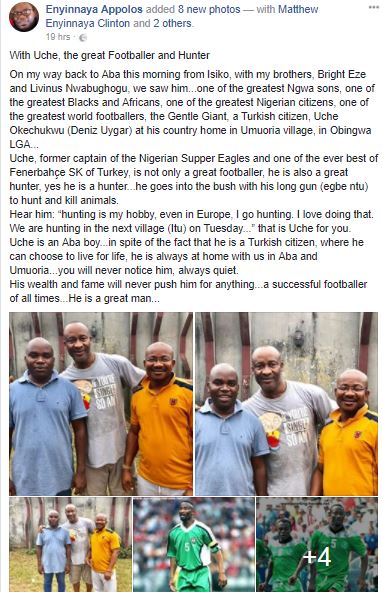Uche, former captain of the Nigerian Supper Eagles and one of the ever best of Fenerbahçe SK if Turkey, is not only a great footballer, he is also a great hunter, yes he is a hunter…he goes into the bush with his long gun (egbe ntu) to hunt and kill animals.