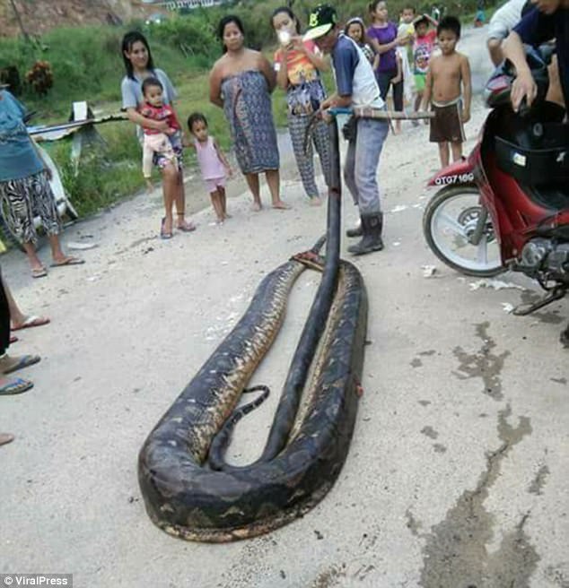 A massive 20 foot female python and the tiny male have been killed while mating by hungry villagers who chopped up the creatures and cooked them in a stir fry.