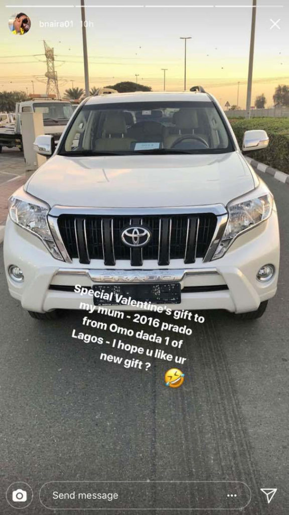 Taking to his social media page to show off the car, B-Naira wrote: “Happy Valentine’s day to my sweet mum – Enjoy your new ride with so much joy – Special gift from omo dada 1 to iya dada 1.”