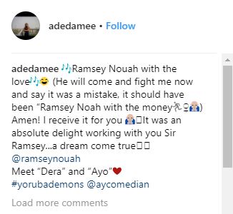 "Ramsey Nouah with the love (He will come and fight me now and say it was a mistake, it should have been “Ramsey Noah with the money) Amen! I receive it for you. It was an absolute delight working with you Sir Ramsey...a dream come true" she captioned the photos they took on set.