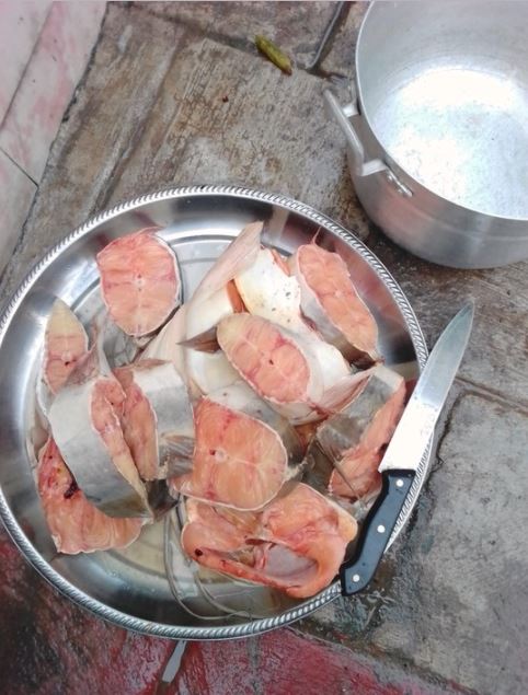 A social media user based in Imo State has shared pictures of a massive cat fish he bought at the Oguta Lake from a fisherman.
