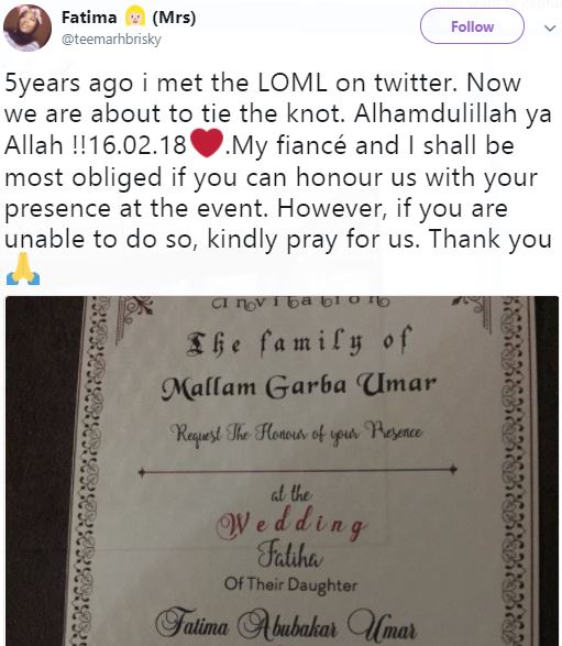 The couple identified as Fatima Abubakar Umar and Salim Abdulqadir Ahmed met on Twitter and their story was shared online by the new bride.