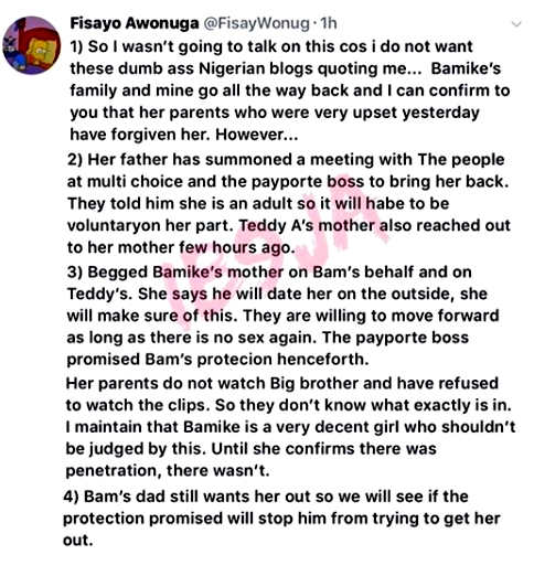 A family member of the embattled housemate identified as Fisayo Awonuga, took to her Twitter page (@FisayWonug), and revealed that Bambam's parents are furious after her toilet escapade, and have demanded that she should be brought back home.