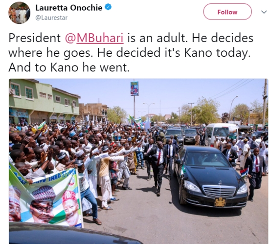“President @MBuhari is an adult. He decides where he goes. He decided it’s Kano today. And to Kano he went,” she wrote.