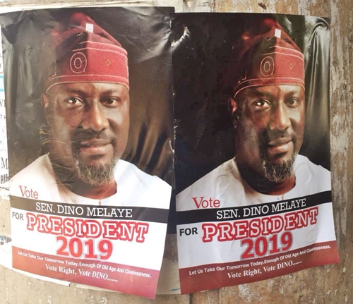 The posters was captured with the caption: “Vote Sen. Dino Melaye for president 2019, Let us take our tomorrow today. Enough of old age and cluelessnes vote right, vote Dino.”