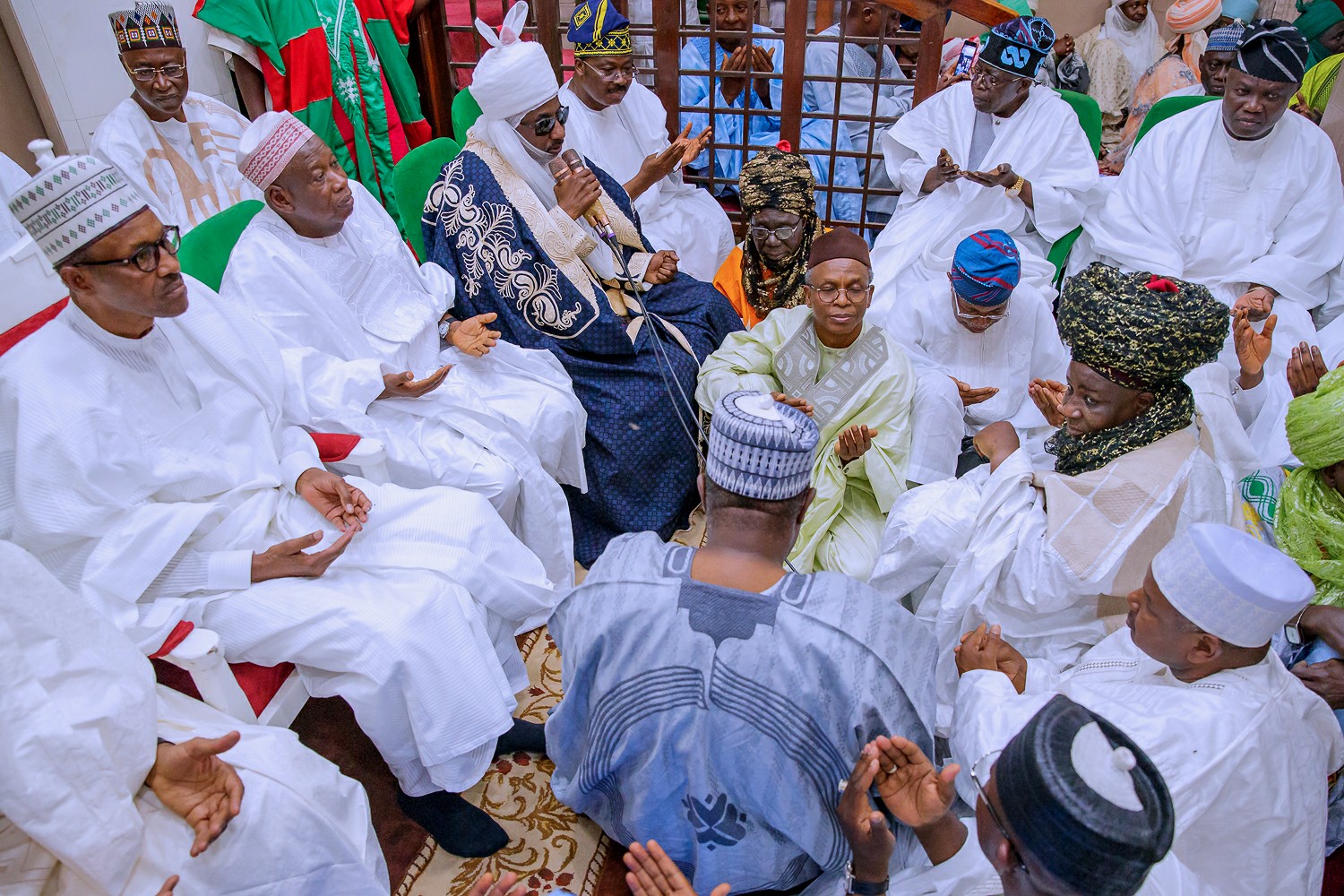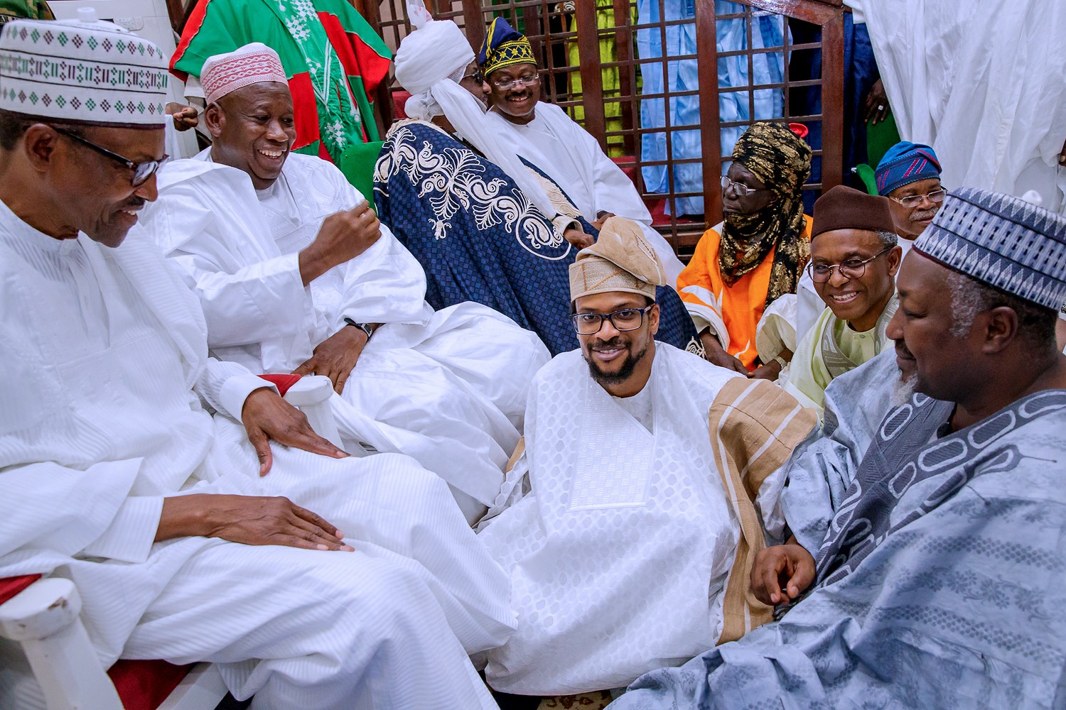 At the ceremony, the President posed for photos with father of the bride and Kano State Governor Abdullahi Umar Ganduje; Emir of Kano H.H. Muhammadu Sanusi II; Father of the Groom and Oyo State Governor Abiola Ajimobi; Kaduna State Governor Mallam Nasir El-Rufai; groom Idris Abiola Ajimobi and Jigawa State Governor Muhammad Badaru Abubakar.