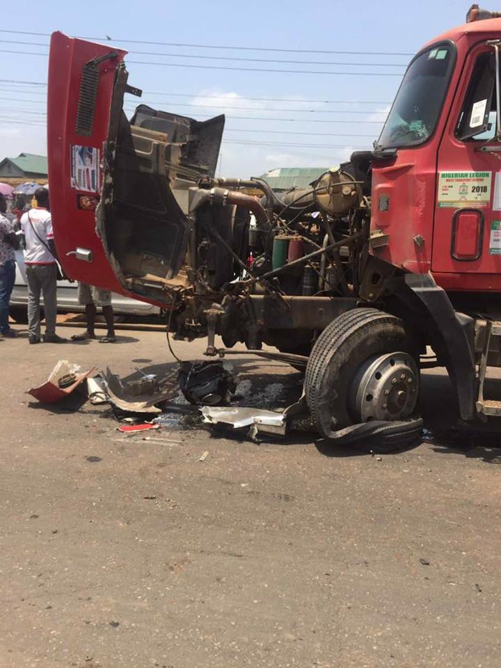 Local reports show that when it became apparent that the two vehicles were going to collide, the driver of Ejiro Onovughe Motors used his side to collide with the trailer on purpose in order to avoid causalities from the passengers’ side.
