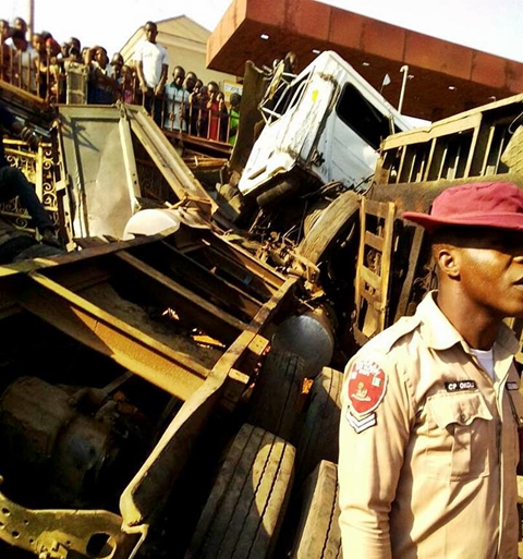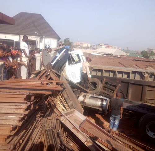 It was gathered that a girl child was killed and one other person injured in the process of the crash which occurred after a 40ft container fell from an articulated vehicle and caused havoc in the area.