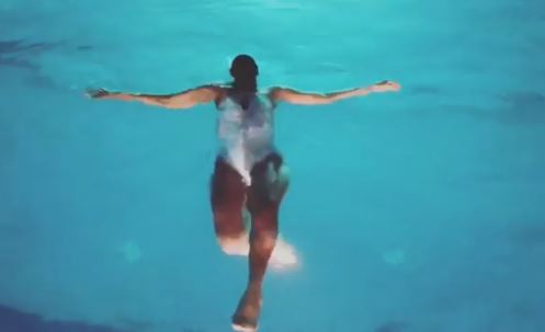The "Jamb Question" crooner is seen in the water wading around like a fish after apparently taking a plunge into the cooling liquid.