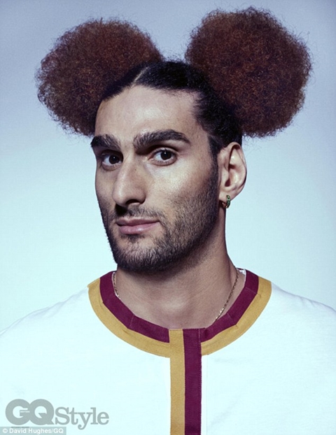 Manchester United midfielder, Marouane Fellaini, as you've never seen him before, has posed topless with his famous hair in Mickey Mouse-style bunches for GQ photo-shoot.