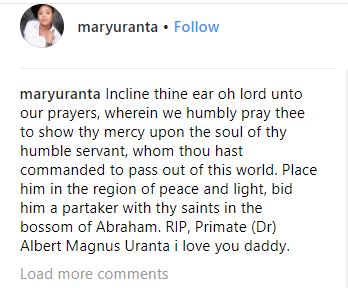 “Incline thine ear oh lord unto our prayers, wherein we humbly pray thee to show thy mercy upon the soul of thy humble servant, whom thou hast commanded to pass out of this world. Place him in the region of peace and light, bid him a partaker with thy saints in the bossom of Abraham. RIP, Primate (Dr) Albert Magnus Uranta i love you daddy.”
