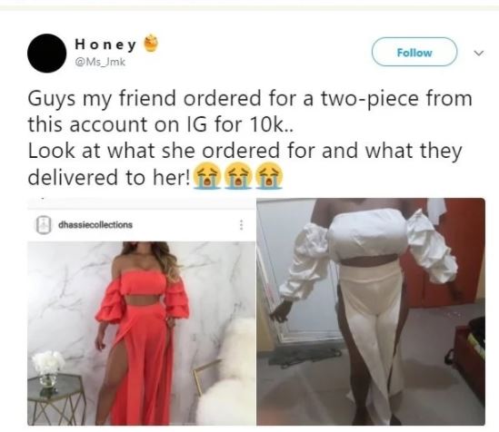 "Guys my friend ordered for a two-piece from this account on IG for N10k..look at what she ordered for and what they delivered to her!"