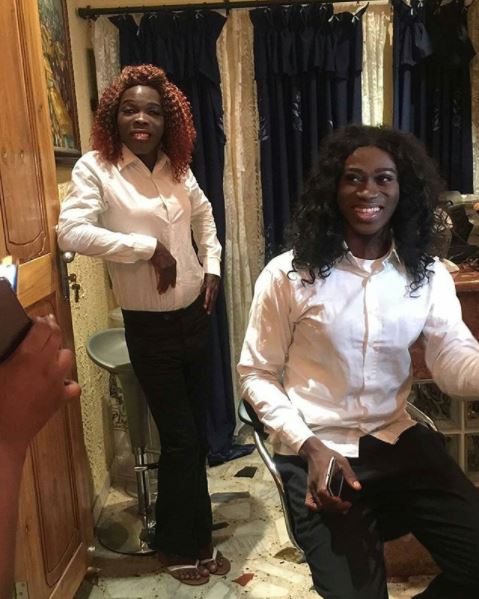 Adedimeji Lateef and Ijebu are up to something massive and hilarious as they were pictured on set dressed as women rocking white shirts and black trousers.