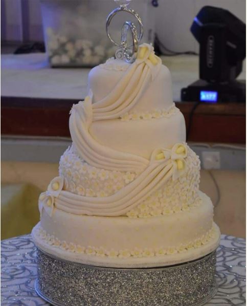 “The cake I baked and decorated for my daughters wedding day. Trimmed the cake board with crochet.....The things our great mothers taught us!”