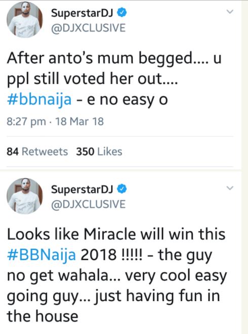'Looks like Miracle will win this #2018 !!!!! - the guy no get wahala... very cool easy going guy... just having fun in the house" he tweeted, predicting that Miracle will win the game.