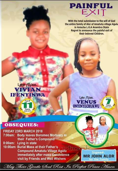 Two innocent sisters, Vivian Ifenyinwa and Venus Onyinyechukwu will be buried tomorrow, Friday 23rd March, 2018 at their father's compound in Amatutu village, Agulu area of Anambra State.