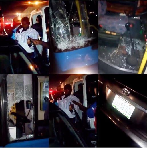 According to reports, trouble started when the man brought out his car's jack from his booth and smashed the bus' windscreen allegedly on the grounds that the bus had scratched his car.