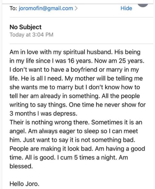 Online psychologist and love doctor, Joro Olumofin has shared the story of a lady who is dating someone in her dreams regarded as a 'spiritual husband'.
