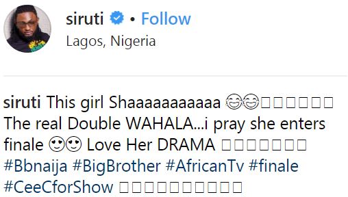 ”The real Double Wahala…I pray she enters finale, Love her Drama.”