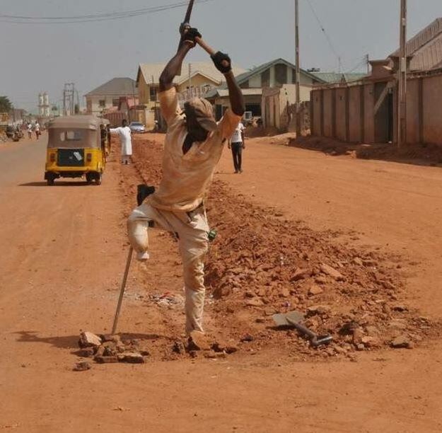 Abdulrahman, who has only one leg to operate with, was seen by the road side, engaged in a really tasking job of digging out a drainage.