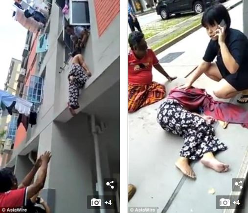 Photos have shown the shocking moment a man in Singapore caught a falling woman by the hair, only to drop her moments later because his hands were greasy.