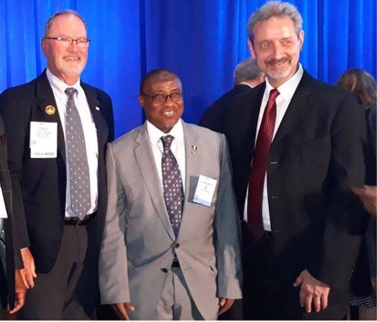 The NNPC boss as seen in the middle above looked odd as he wore an ash-coloured suit with very long sleeves that almost covered his hands. Mr. Baru was pictured in Houston, Texas - USA when he attended the 50th Anniversary of Offshore Technology Conference.