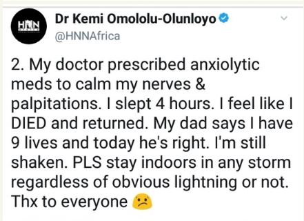She is currently recuperating from the incident. She related that her doctor came in later and prescribed anxiolytic medicine to calm her nerves and palpitation. “I slept for 4 hours. I feel like I died and I returned. My dad said I have 9 lives and today he is right”, she said and advised Nigerians to always stay indoors when there is thunder and lightening.