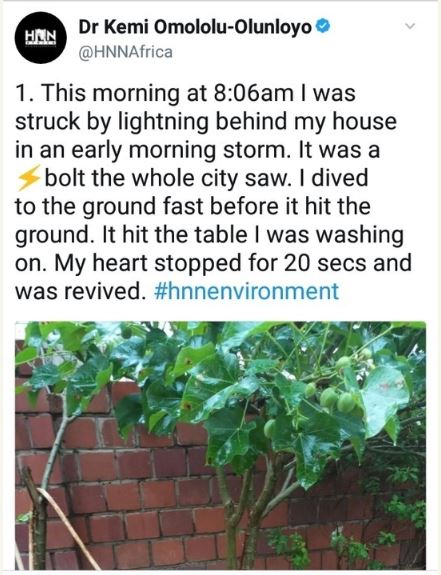 1. This morning at 8:06am I was struck by lightning behind my house in an early morning storm. It was a  bolt the whole city saw. I dived to the ground fast before it hit the ground. It hit the table I was washing on. My heart stopped for 20 secs and was revived. #hnnenvironment