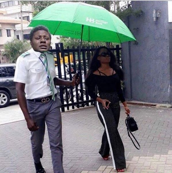 In the original photo, a security man attached to Heritage Bank Plc was pictured helping Cee-C with an umbrella to prevent the direct impact of the heat of the sun on her.